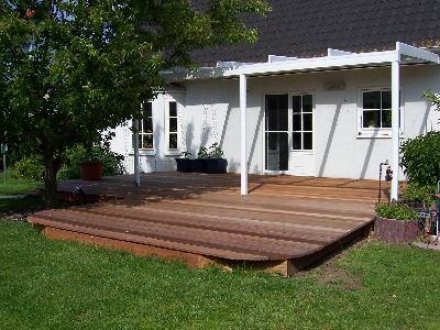 Die Terrasse aus Bankirai ist von oben sichtbar mit Edelstahlschrauben verschraubt worden.